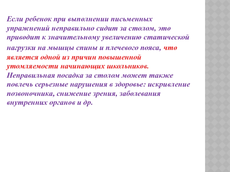приводит к значительному увеличению статической нагрузки на мышцы спины и плечевого пояса, что является одной из причин повышенной утомляемости начинающих школьников. Неправильная посадка за столом может также повлечь серьезные нарушения в здоровье: искривление позвоночника, снижение зрения, заболевания внутренних органов и др.