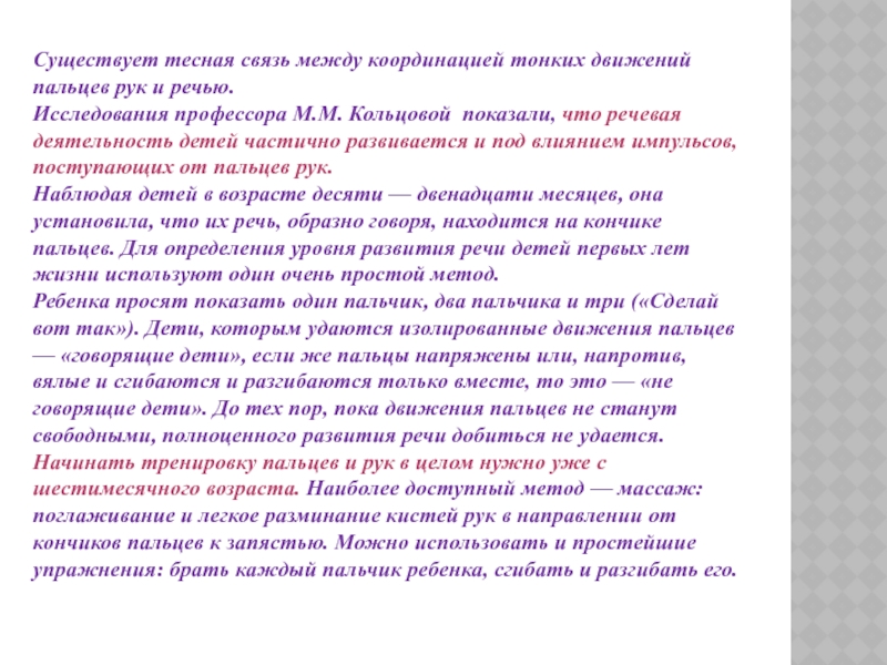 Исследования профессора М.М. Кольцовой показали, что речевая деятельность детей частично развивается и под влиянием импульсов, поступающих от пальцев рук. Наблюдая детей в возрасте десяти — двенадцати месяцев, она установила, что их речь, образно говоря, находится на кончике пальцев. Для определения уровня развития речи детей первых лет жизни используют один очень простой метод.