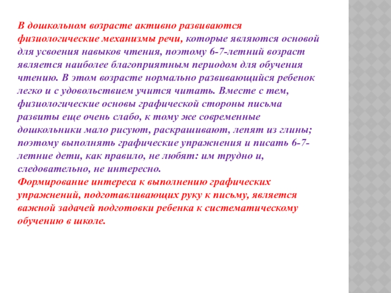 для усвоения навыков чтения, поэтому 6-7-летний возраст является наиболее благоприятным периодом для обучения чтению. В этом возрасте нормально развивающийся ребенок легко и с удовольствием учится читать. Вместе с тем, физиологические основы графической стороны письма развиты еще очень слабо, к тому же современные дошкольники мало рисуют, раскрашивают, лепят из глины; поэтому выполнять графические упражнения и писать 6-7-летние дети, как правило, не любят: им трудно и, следовательно, не интересно.