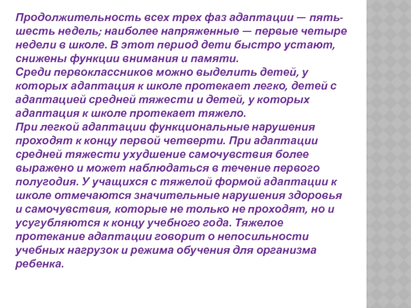 При легкой адаптации функциональные нарушения проходят к концу первой четверти. При адаптации средней тяжести ухудшение самочувствия более выражено и может наблюдаться в течение первого полугодия. У учащихся с тяжелой формой адаптации к школе отмечаются значительные нарушения здоровья и самочувствия, которые не только не проходят, но и усугубляются к концу учебного года. Тяжелое протекание адаптации говорит о непосильности учебных нагрузок и режима обучения для организма ребенка.