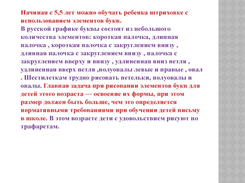 букв. В русской графике буквы состоят из небольшого количества элементов: короткая палочка, длинная палочка , короткая палочка с закруглением внизу , длинная палочка с закруглением внизу , палочка с закруглением вверху и внизу , удлиненная вниз петля , удлиненная вверх петля ,полуовалы левые и правые , овал . Шестилеткам трудно рисовать петельки, полуовалы и овалы. Главная задача при рисовании элементов букв для детей этого возраста — освоение их формы, при этом размер должен быть больше, чем это определяется нормативными требованиями при обучении детей письму в школе. В этом возрасте дети с удовольствием рисуют по трафаретам.
