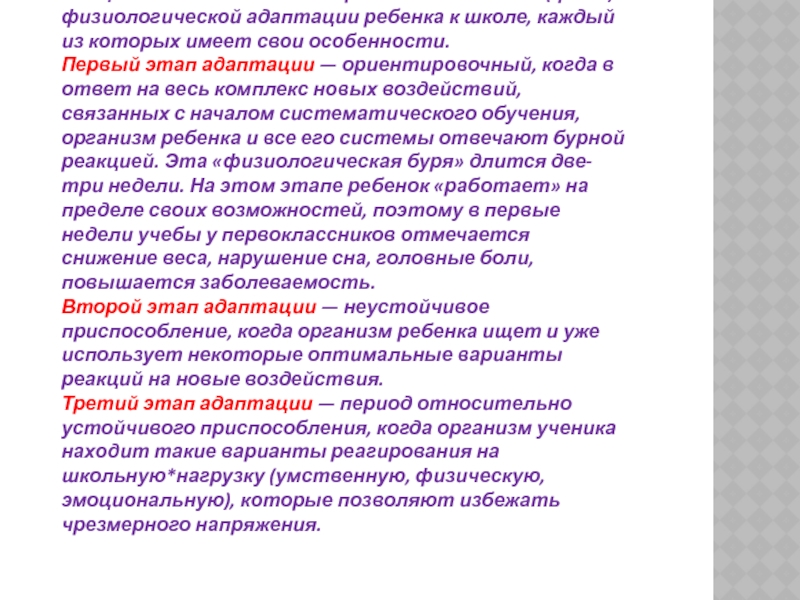 Слайд 4Специалисты выделяют три основных этапа (фазы) физиологической адаптации ребенка к школе,
