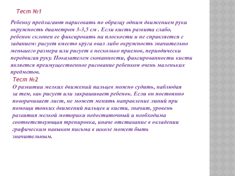 см . Если кисть развита слабо, ребенок склонен ее фиксировать на плоскости и не справляется с заданием: рисует вместо круга овал либо окружность значительно меньшего размера или рисует в несколько приемов, периодически передвигая руку. Показателем скованности, фиксированности кисти является преимущественное рисование ребенком очень маленьких предметов.