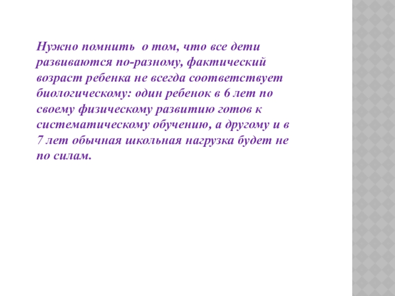 ребенка не всегда соответствует биологическому: один ребенок в 6 лет по своему физическому развитию готов к систематическому обучению, а другому и в 7 лет обычная школьная нагрузка будет не по силам.