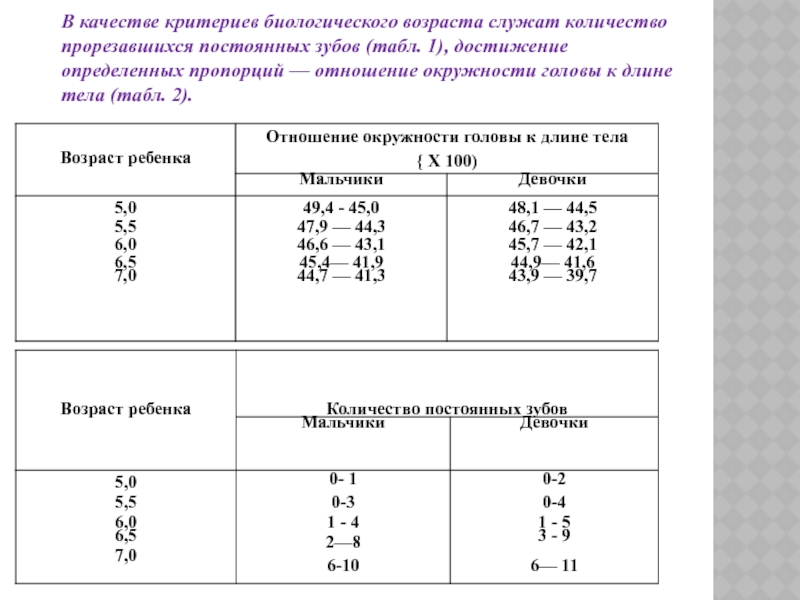 Слайд 11В качестве критериев биологического возраста служат количество прорезавшихся постоянных зубов (табл.