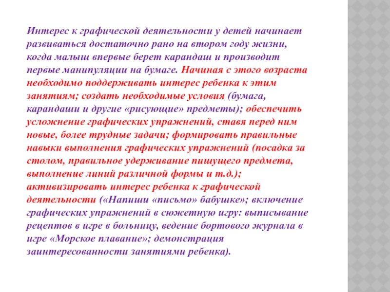 втором году жизни, когда малыш впервые берет карандаш и производит первые манипуляции на бумаге. Начиная с этого возраста необходимо поддерживать интерес ребенка к этим занятиям; создать необходимые условия (бумага, карандаши и другие «рисующие» предметы); обеспечить усложнение графических упражнений, ставя перед ним новые, более трудные задачи; формировать правильные навыки выполнения графических упражнений (посадка за столом, правильное удерживание пишущего предмета, выполнение линий различной формы и т.д.); активизировать интерес ребенка к графической деятельности («Напиши «письмо» бабушке»; включение графических упражнений в сюжетную игру: выписывание рецептов в игре в больницу, ведение бортового журнала в игре «Морское плавание»; демонстрация заинтересованности занятиями ребенка).