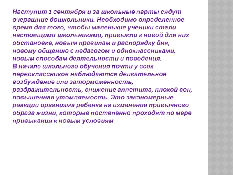 Слайд 3Наступит 1 сентября и за школьные парты сядут вчерашние дошкольники. Необходимо