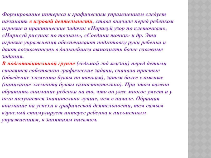 Слайд 28Формирование интереса к графическим упражнениям следует начинать в игровой деятельности, ставя