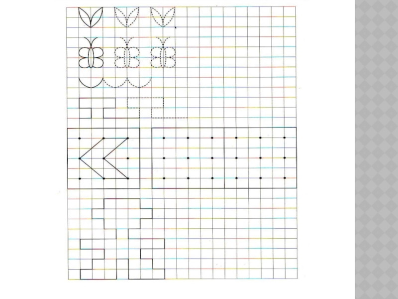 вначале перед ребенком игровые и практические задачи: «Нарисуй узор по клеточкам», «Нарисуй рисунок по точкам», «Соедини точки» и др. Эти игровые упражнения обеспечивают подготовку руки ребенка и дают возможность в дальнейшем выполнять более сложные задания.