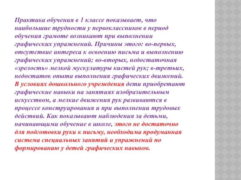 в период обучения грамоте возникают при выполнении графических упражнений. Причины этого: во-первых, отсутствие интереса к освоению письма и выполнению графических упражнений; во-вторых, недостаточная «зрелость» мелкой мускулатуры кистей рук; в-третьих, недостаток опыта выполнения графических движений.
