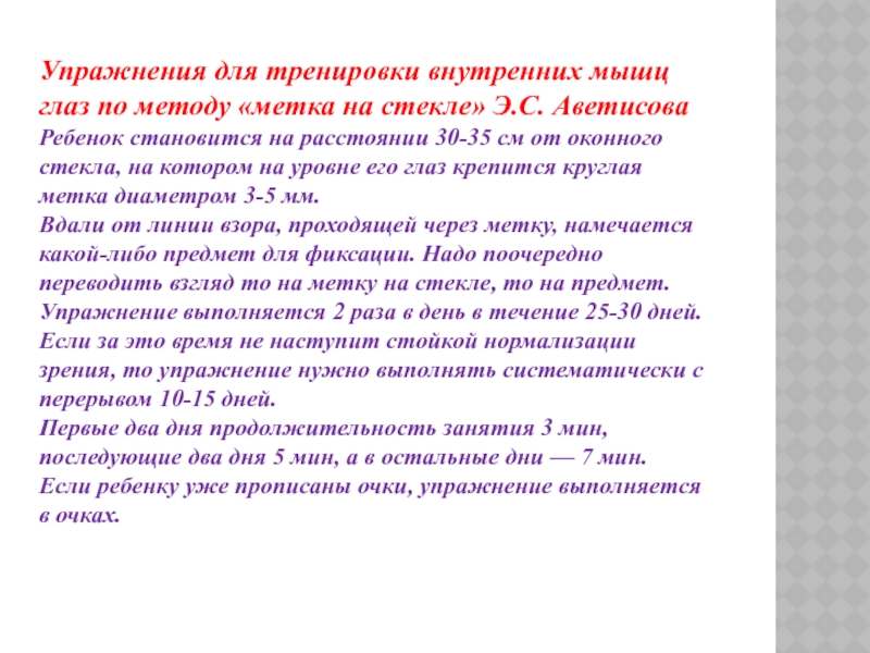 Вдали от линии взора, проходящей через метку, намечается какой-либо предмет для фиксации. Надо поочередно переводить взгляд то на метку на стекле, то на предмет. Упражнение выполняется 2 раза в день в течение 25-30 дней. Если за это время не наступит стойкой нормализации зрения, то упражнение нужно выполнять систематически с перерывом 10-15 дней.