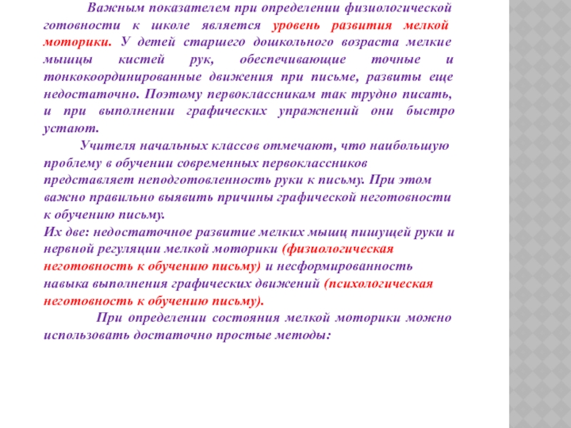 к школе является уровень развития мелкой моторики. У детей старшего дошкольного возраста мелкие мышцы кистей рук, обеспечивающие точные и тонкокоординированные движения при письме, развиты еще недостаточно. Поэтому первоклассникам так трудно писать, и при выполнении графических упражнений они быстро устают.