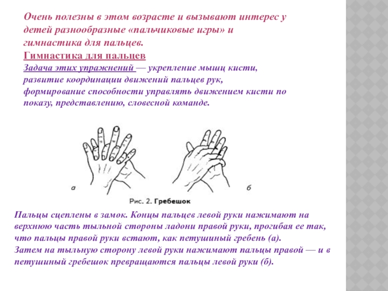 Затем на тыльную сторону левой руки нажимают пальцы правой — и в петушиный гребешок превращаются пальцы левой руки (б).