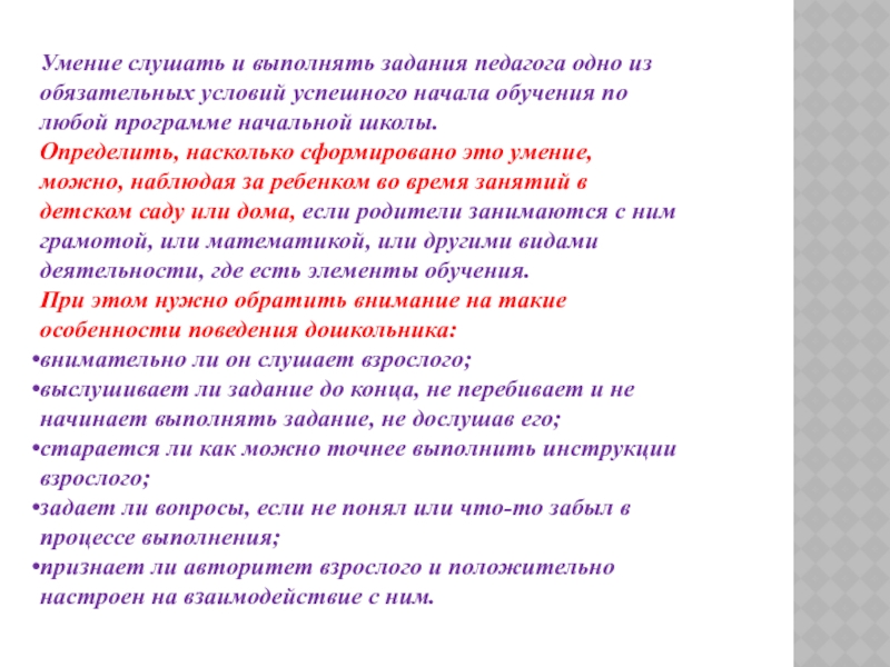 Слайд 24Умение слушать и выполнять задания педагога одно из обязательных условий успешного