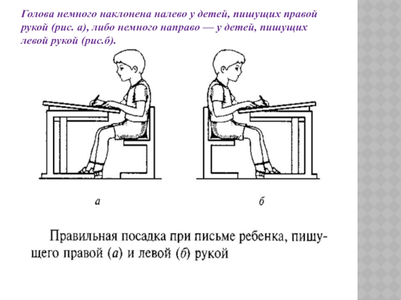 Слайд 68Голова немного наклонена налево у детей, пишущих правой рукой (рис. а),