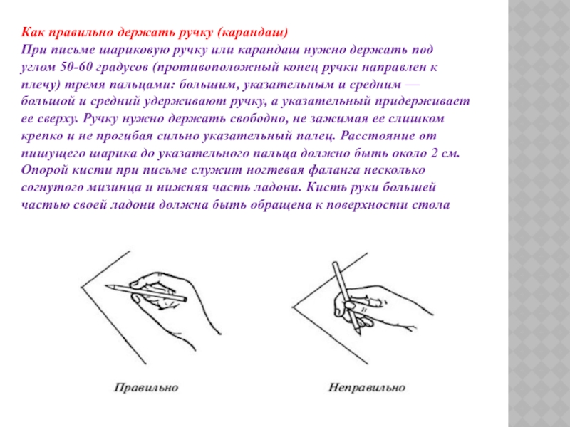 держать под углом 50-60 градусов (противоположный конец ручки направлен к плечу) тремя пальцами: большим, указательным и средним — большой и средний удерживают ручку, а указательный придерживает ее сверху. Ручку нужно держать свободно, не зажимая ее слишком крепко и не прогибая сильно указательный палец. Расстояние от пишущего шарика до указательного пальца должно быть около 2 см. Опорой кисти при письме служит ногтевая фаланга несколько согнутого мизинца и нижняя часть ладони. Кисть руки большей частью своей ладони должна быть обращена к поверхности стола