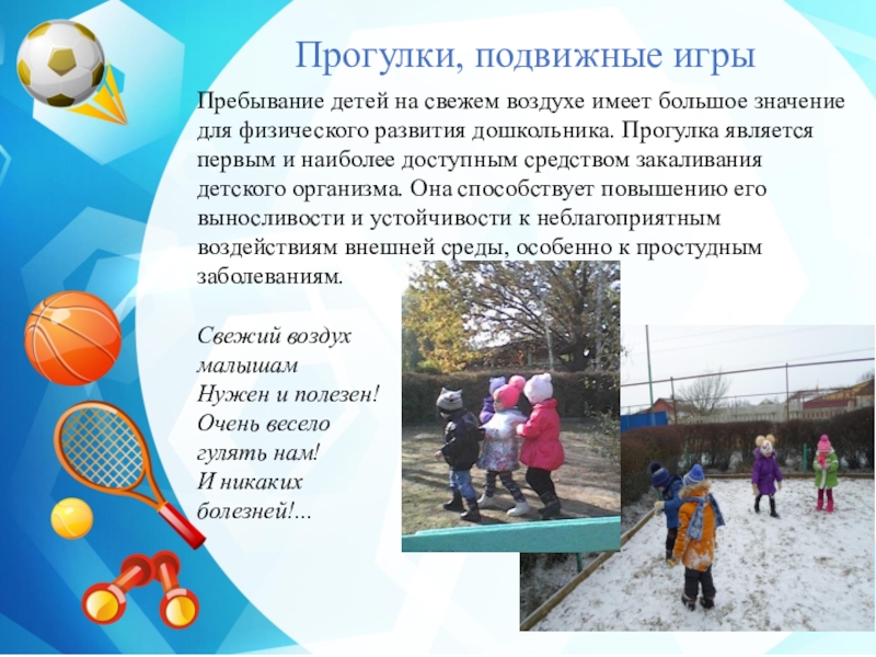 Пребывание детей на свежем воздухе имеет большое значение для физического развития дошкольника. Прогулка является первым и наиболее доступным средством закаливания детского организма. Она способствует повышению его выносливости и устойчивости к неблагоприятным воздействиям внешней среды, особенно к простудным заболеваниям.