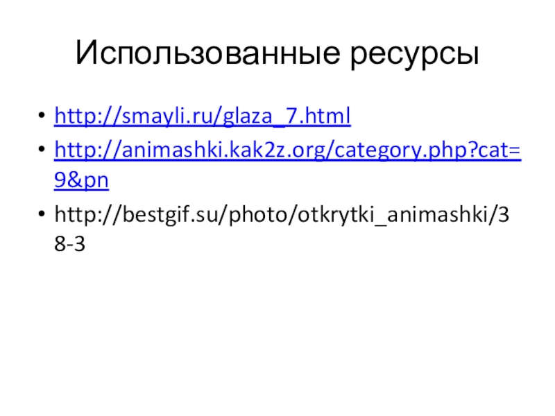 Использованные ресурсыhttp://smayli.ru/glaza_7.htmlhttp://animashki.kak2z.org/category.php?cat=9&pnhttp://bestgif.su/photo/otkrytki_animashki/38-3