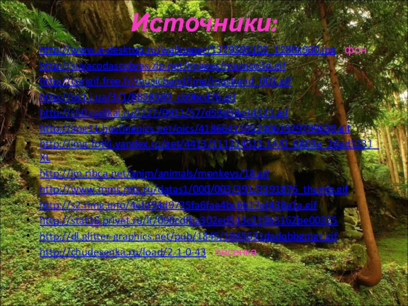 Источники:http://www.e-desktop.ru/wallpaper/1379395105_1280x960.jpg - фонhttp://suvacodascobras.zip.net/images/macaco3d.gifhttp://corigif.free.fr/musicband/img/musband_003.gifhttp://os1.i.ua/3/1/8838589_cb96cd76.gifhttp://s50.radikal.ru/i127/0911/57/d59d58e34121.gifhttp://img11.hostingpics.net/pics/418664110524061929799630.gifhttp://img-fotki.yandex.ru/get/4413/111214513.14/0_6803e_26ad1231_XLhttp://im.ribca.net/anim/animals/monkeys/18.gifhttp://www.mms.mts.ru/datas1/000/003/391/3391876_thumb.gifhttp://s2.rimg.info/4efd94d9735fa6fae4bc6b17ef438a1a.gifhttp://stat16.privet.ru/lr/090cdfba302ed543c210b5162be00325http://dl.glitter-graphics.net/pub/1845/1845631dadqbbgmgr.gifhttp://chudesenka.ru/load/2-1-0-43 - песенка