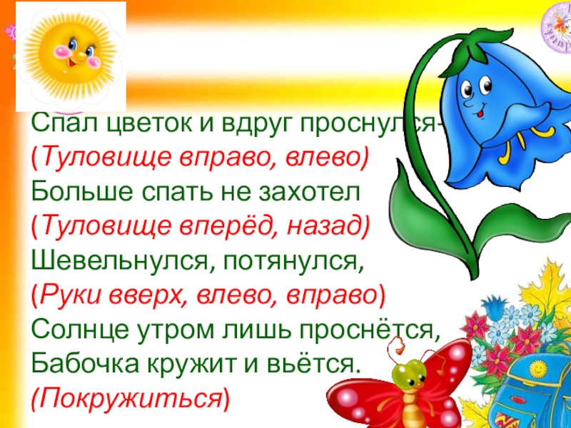 Спал цветок и вдруг проснулся-(Туловище вправо, влево)Больше спать не захотел(Туловище вперёд, назад)Шевельнулся, потянулся,(Руки вверх, влево, вправо)Солнце утром