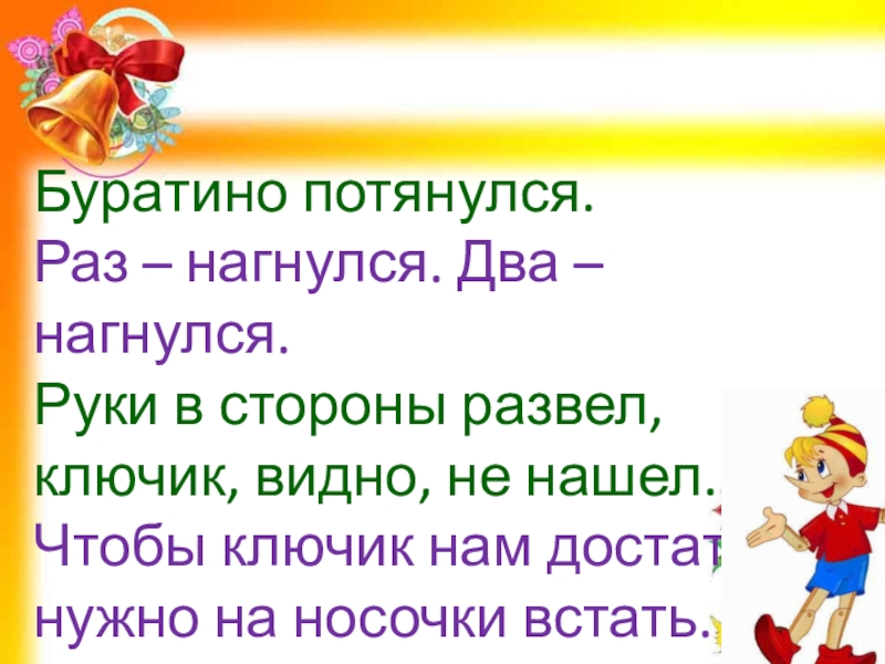Буратино потянулся. Раз – нагнулся. Два – нагнулся. Руки в стороны развел, ключик, видно, не нашел. Чтобы