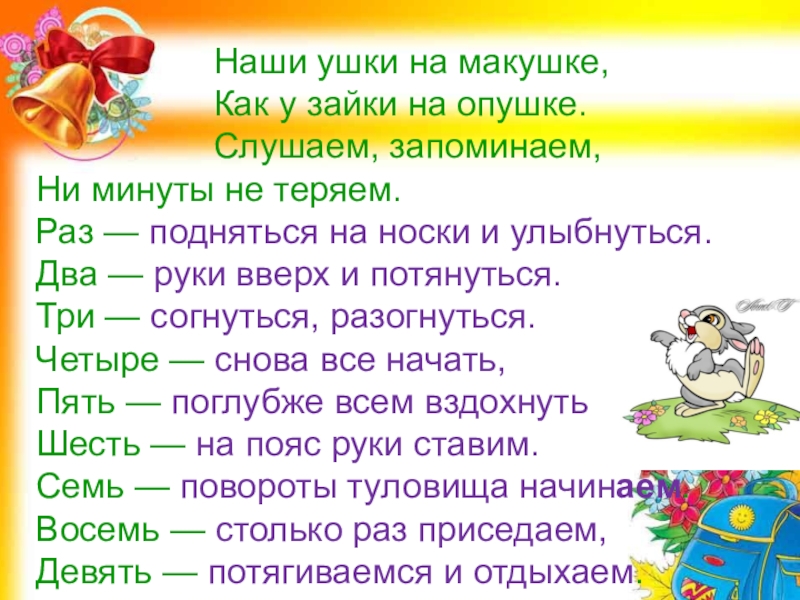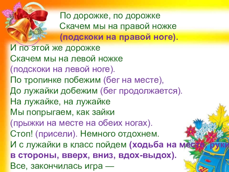 И с лужайки в класс пойдем (ходьба на месте, руки в стороны, вверх, вниз, вдох-выдох).