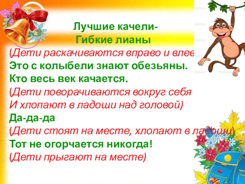 Лучшие качели- Гибкие лианы(Дети раскачиваются вправо и влево)Это с колыбели