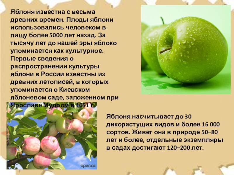 Яблоня насчитывает до 30 дикорастущих видов и более 16 000 сортов. Живет она в природе 50–80 лет и более, отдельные экземпляры в садах достигают 120–200 лет.