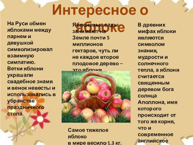 В древних мифах яблоки являются символом знания, мудрости и солнечного тепла, а яблоня считается священным деревом бога солнца Аполлона, имя которого происходит от того же корня, что и современное английское слово apple.