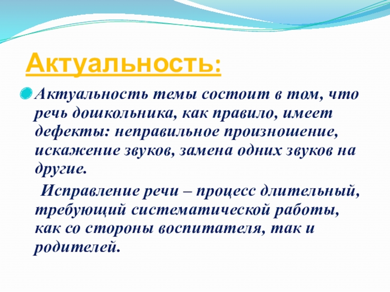 Актуальность:Актуальность темы состоит в том, что речь дошкольника, как правило, имеет дефекты: неправильное произношение, искажение звуков,