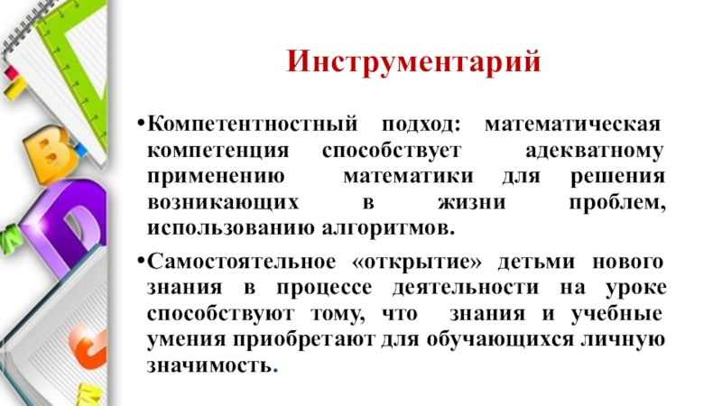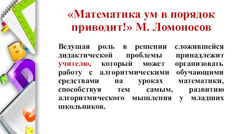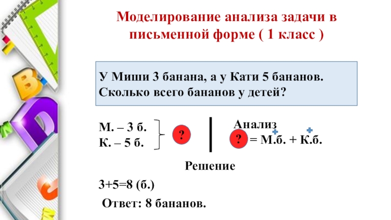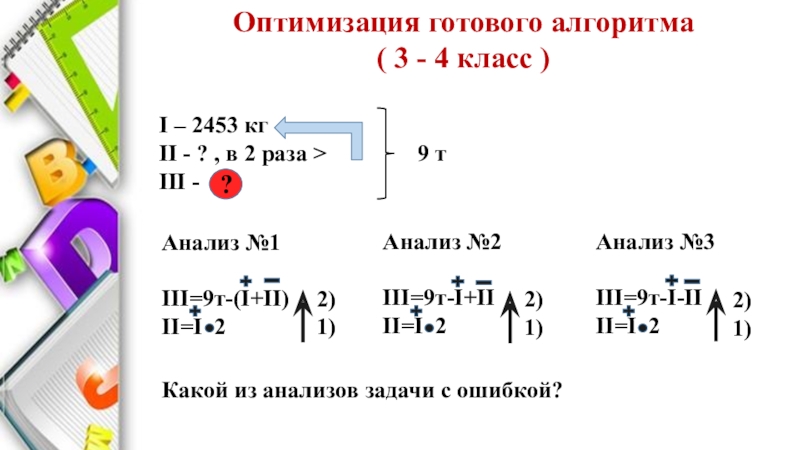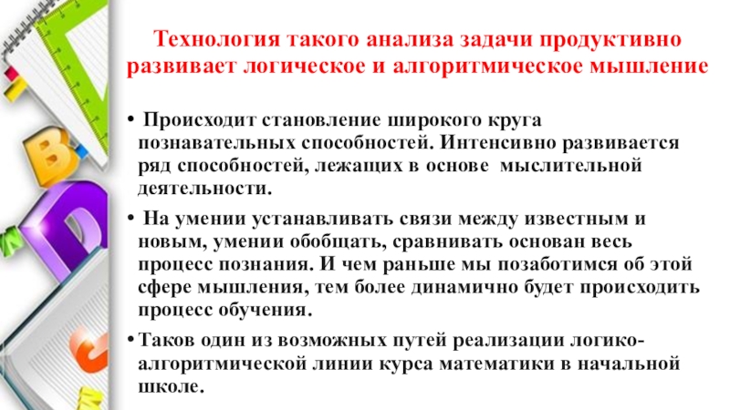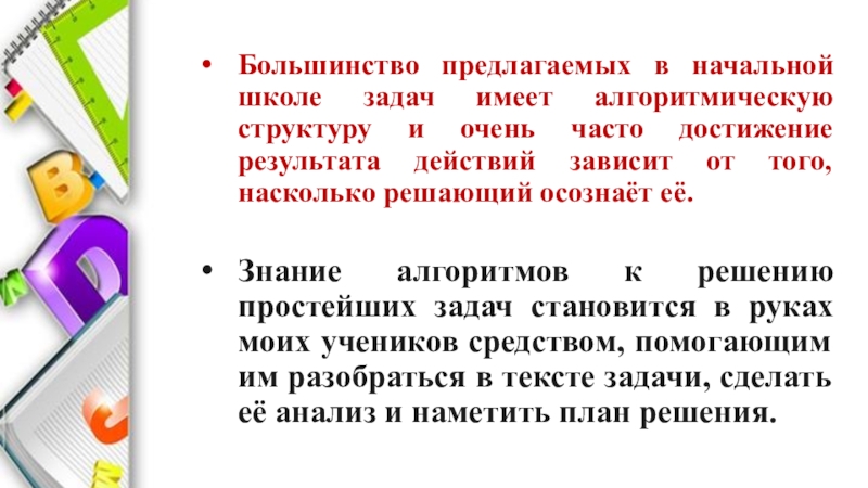 Знание алгоритмов к решению простейших задач становится в руках моих учеников средством, помогающим им разобраться в тексте задачи, сделать её анализ и наметить план решения.