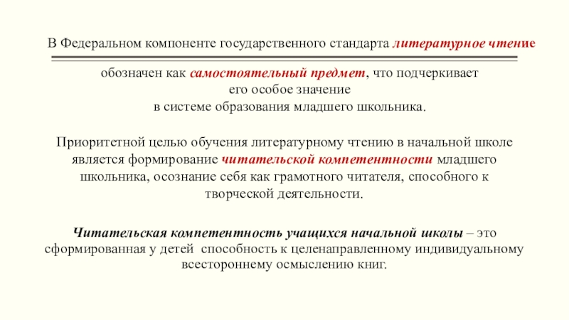 Приоритетной целью обучения литературному чтению в начальной школе является формирование читательской компетентности младшего школьника, осознание себя как грамотного читателя, способного к творческой деятельности.