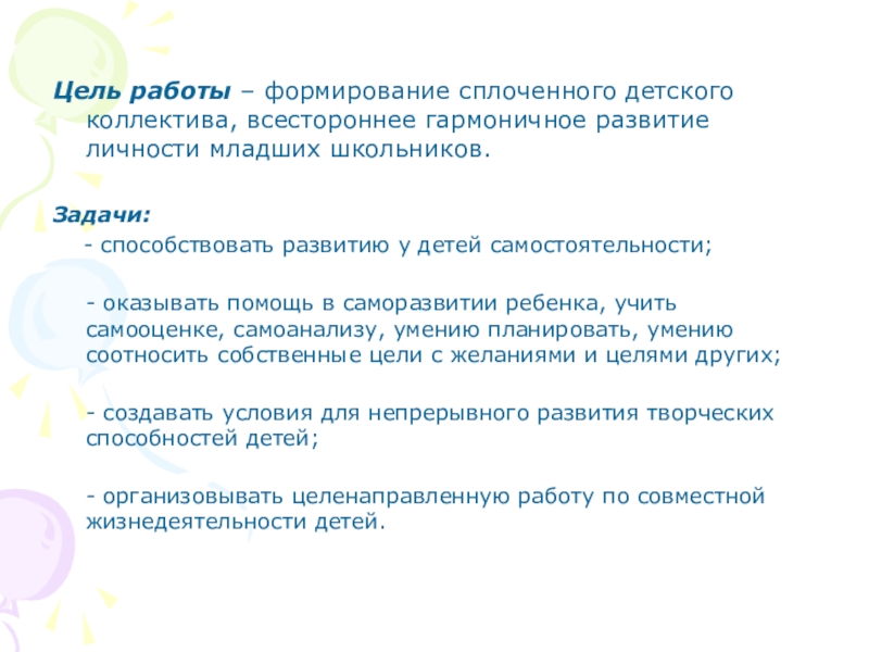 Слайд 7Цель работы – формирование сплоченного детского коллектива, всестороннее гармоничное развитие личности младших