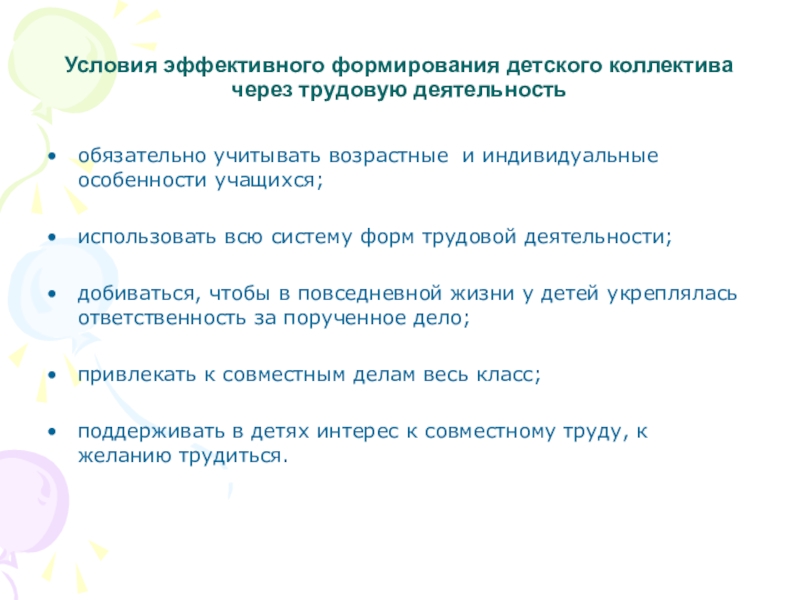 Слайд 12Условия эффективного формирования детского коллектива через трудовую деятельность