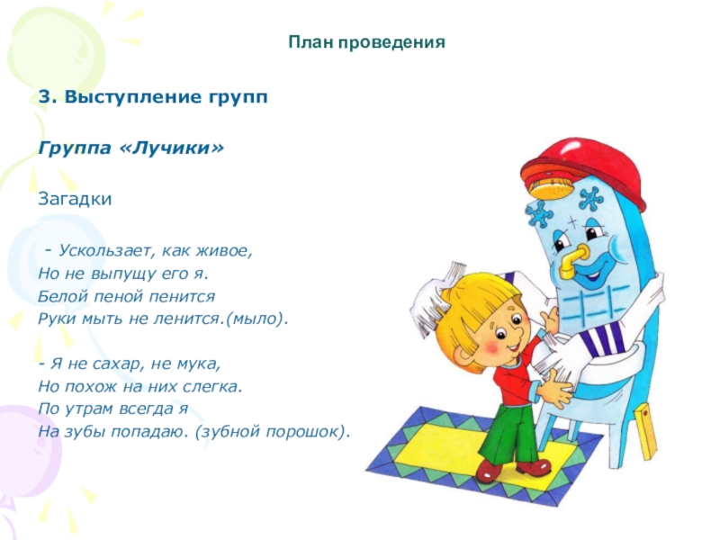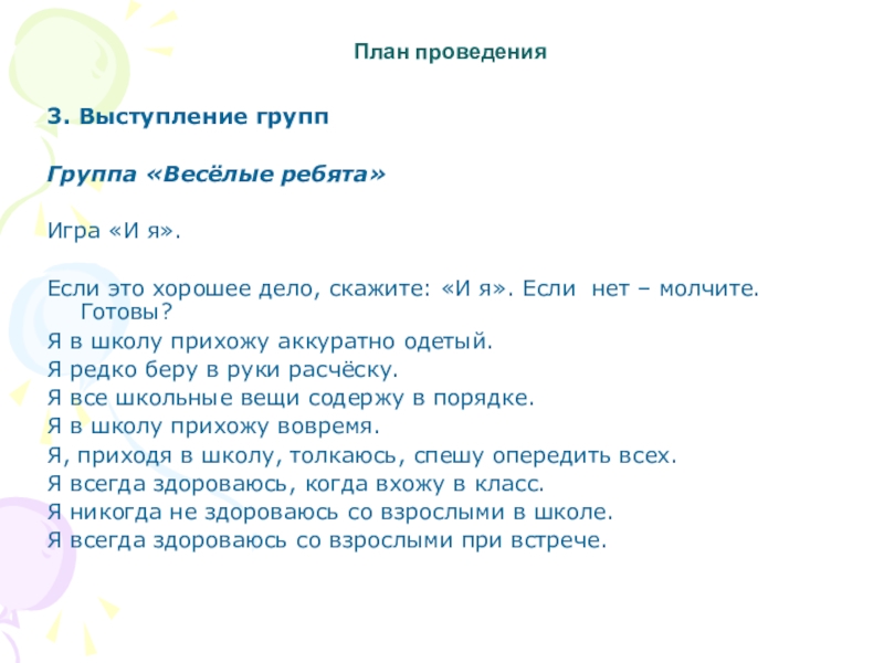 инсценировки, готовят демонстрации одежды и причёсок, изготавливают для себя бейджики с названием группы и её отличительным признаком).