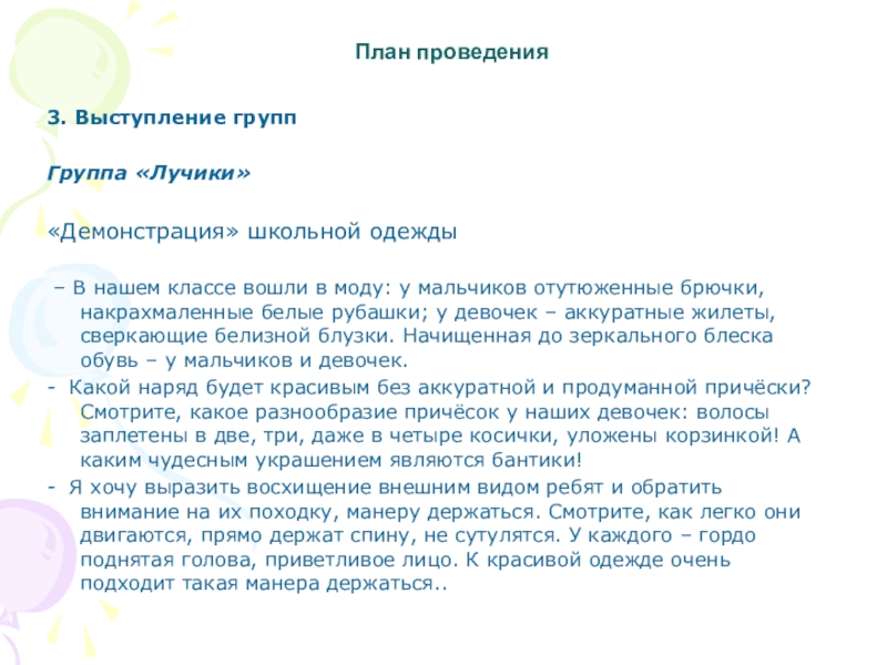 - Я хочу выразить восхищение внешним видом ребят и обратить внимание на их походку, манеру держаться. Смотрите, как легко они двигаются, прямо держат спину, не сутулятся. У каждого – гордо поднятая голова, приветливое лицо. К красивой одежде очень подходит такая манера держаться..