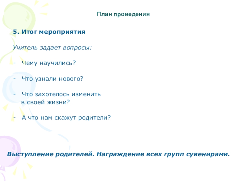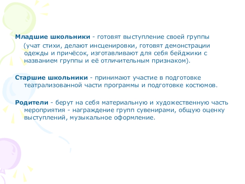Родители - берут на себя материальную и художественную часть мероприятия - награждение групп сувенирами, общую оценку выступлений, музыкальное оформление.