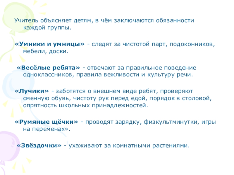 «Румяные щёчки» - проводят зарядку, физкультминутки, игры на переменах».