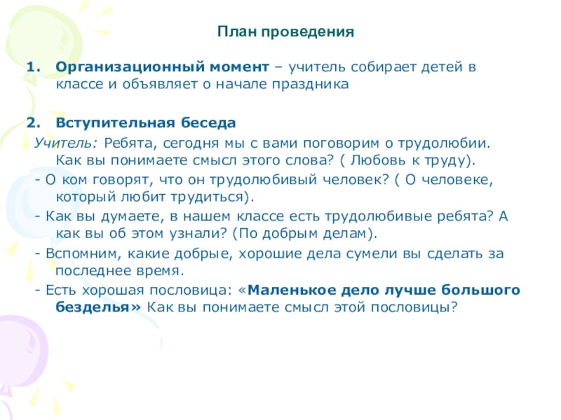 Учитель: Ребята, сегодня мы с вами поговорим о трудолюбии. Как вы понимаете смысл этого слова? ( Любовь к труду).