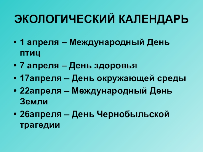 Слайд 11ЭКОЛОГИЧЕСКИЙ КАЛЕНДАРЬ