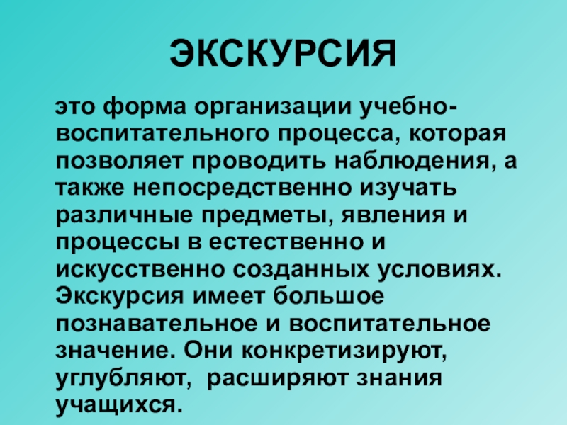 а также непосредственно изучать различные предметы, явления и процессы в естественно и искусственно созданных условиях. Экскурсия имеет большое познавательное и воспитательное значение. Они конкретизируют, углубляют, расширяют знания учащихся.