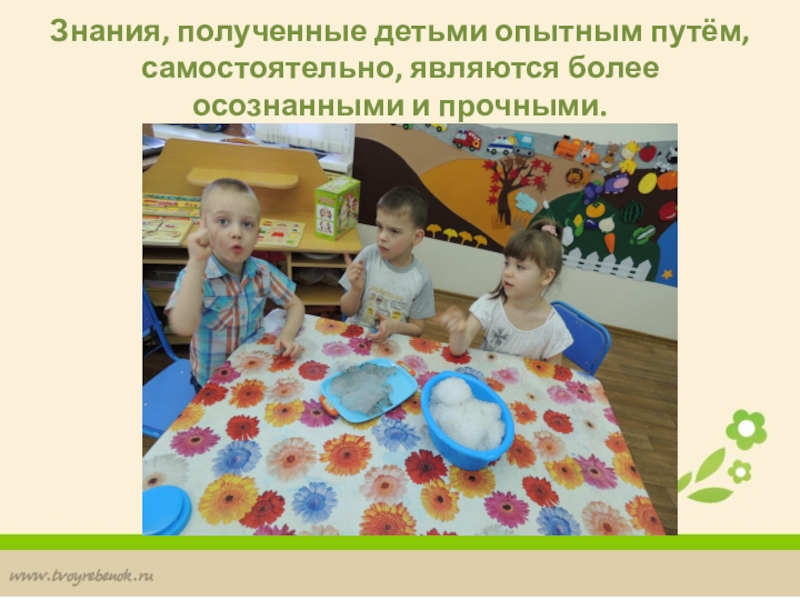 Слайд 3Знания, полученные детьми опытным путём, самостоятельно, являются более осознанными и прочными.