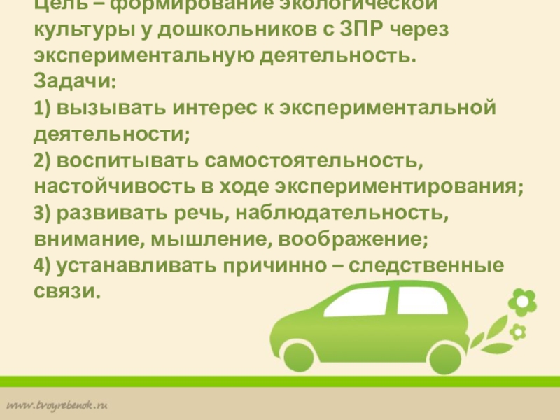 Цель – формирование экологической культуры у дошкольников с ЗПР через экспериментальную деятельность. Задачи:  1) вызывать интерес