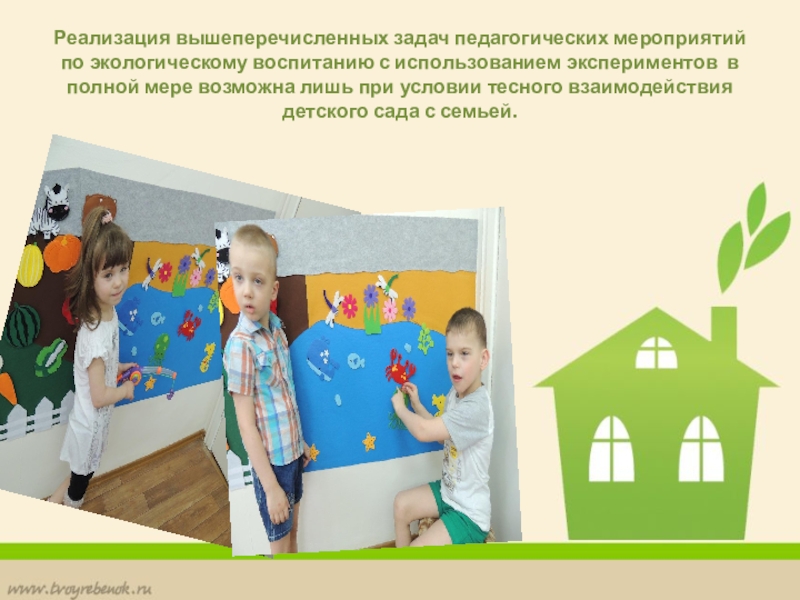 Слайд 6Реализация вышеперечисленных задач педагогических мероприятий по экологическому воспитанию с использованием экспериментов