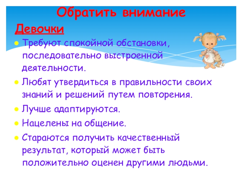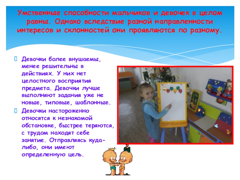 Умственные способности мальчиков и девочек в целом равны. Однако вследствие разной направленности интересов и склонностей они проявляются по разному.