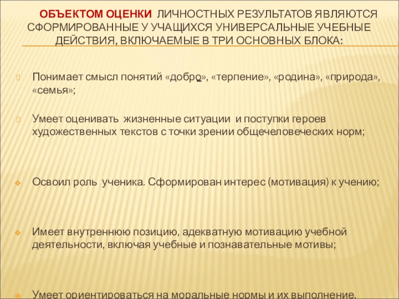Понимает смысл понятий «добро», «терпение», «родина», «природа», «семья»;