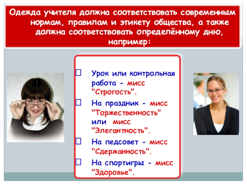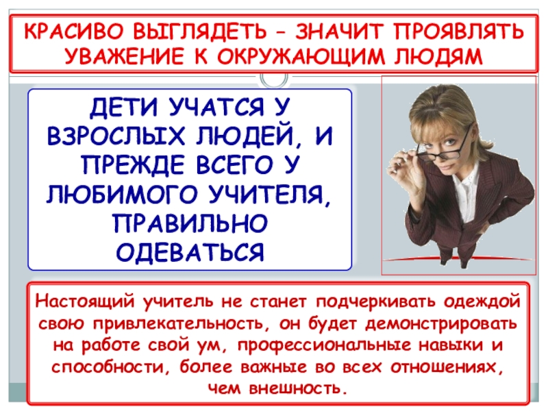 Настоящий учитель не станет подчеркивать одеждой свою привлекательность, он будет демонстрировать на работе свой ум, профессиональные навыки и способности, более важные во всех отношениях, чем внешность.