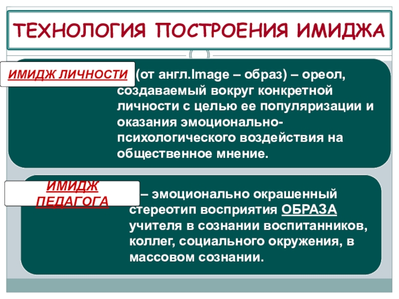 Имидж педагога – эмоционально окрашенный стереотип восприятия ОБРАЗА учителя в сознании воспитанников, коллег, социального окружения, в массовом сознании.