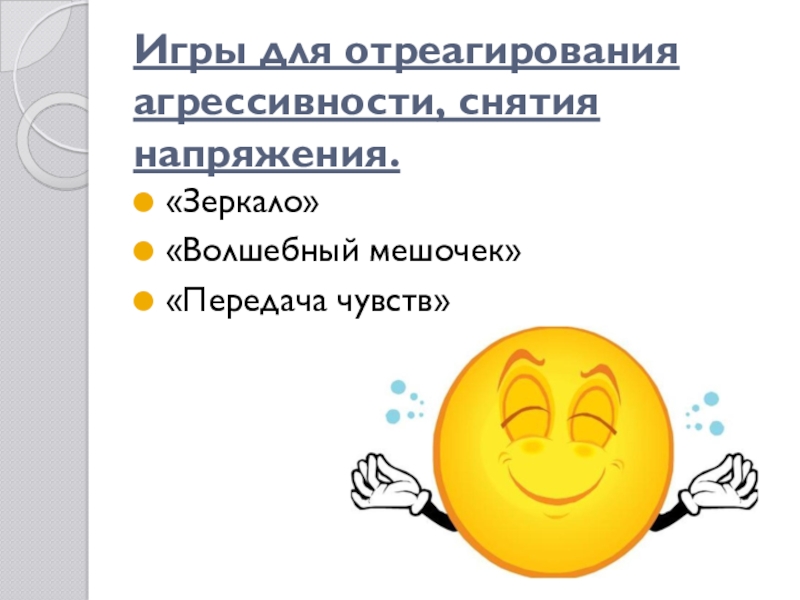 Слайд 19Игры для отреагирования агрессивности, снятия напряжения.