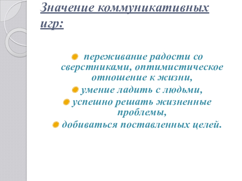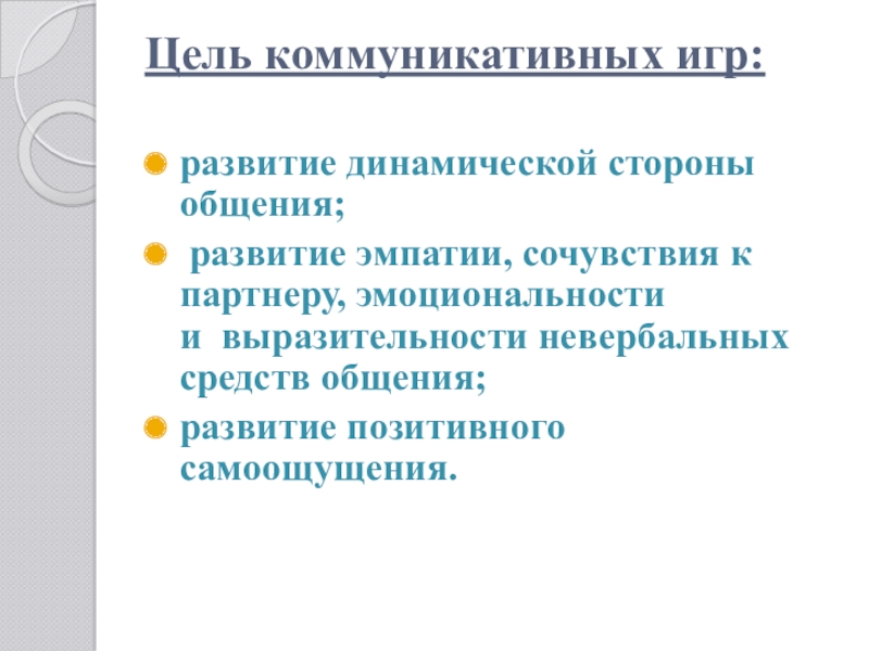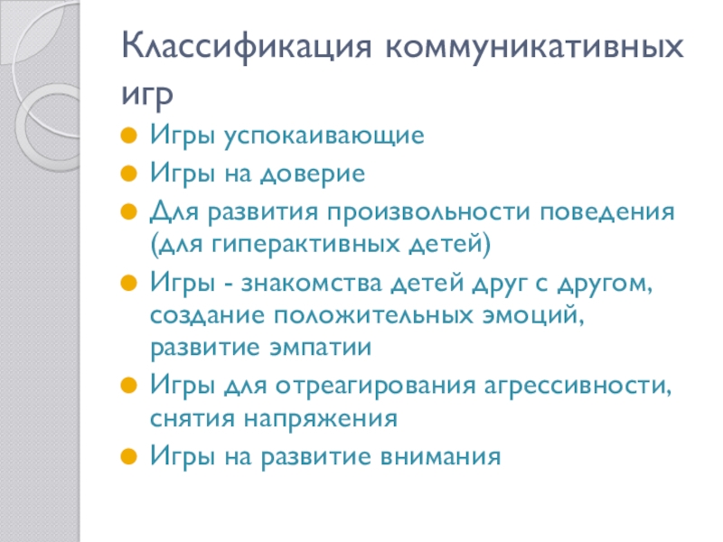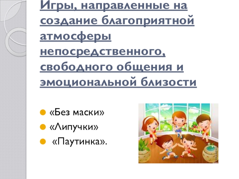 Слайд 21Игры, направленные на создание благоприятной атмосферы непосредственного, свободного общения и эмоциональной